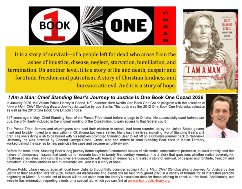 One Book One Cozad is a reading program that encourages Cozadians to read and discuss one specially chosen book. This year's selection is I Am a Man: Chief Standing Bear's Journey for Justice by Joe Starita. Click here for more information and events.